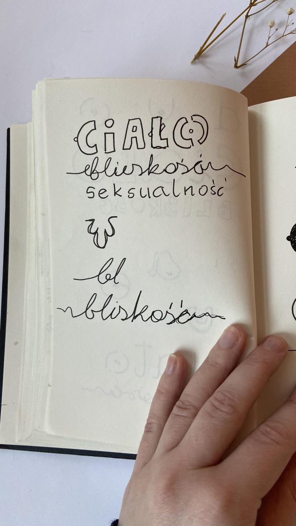 Sporo czasu poświęciłam na poszukiwania pomysłu na zaaranżowanie tytułu i jego symbolikę. Ostatecznie każde z trzech słów CIAŁO – BLISKOŚĆ – SEKSUALNOŚĆ – niesie z sobą ukryty przekaz; czy to w warstwie koloru, doboru fontu (czcionki), czy manipulacji detalem.